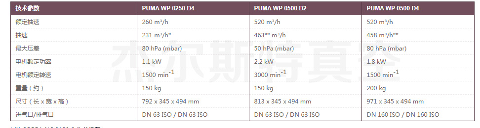 由于其高抽气速率和极限压力, Puma WP 罗茨泵能提高真空泵的性能。 Puma WP 罗 茨泵备有多种尺寸可供选择,可完美应用 于所有粗真空、中真空应用,特别是需要显 著提高前级泵的性能或需要根据工艺对前 级泵进行最佳调试的应用。 Puma WP 0250/0500 D2/D4 是此系列中较小的罗 茨泵。 Puma WP 0500 D4 的特点是压差 非常高。